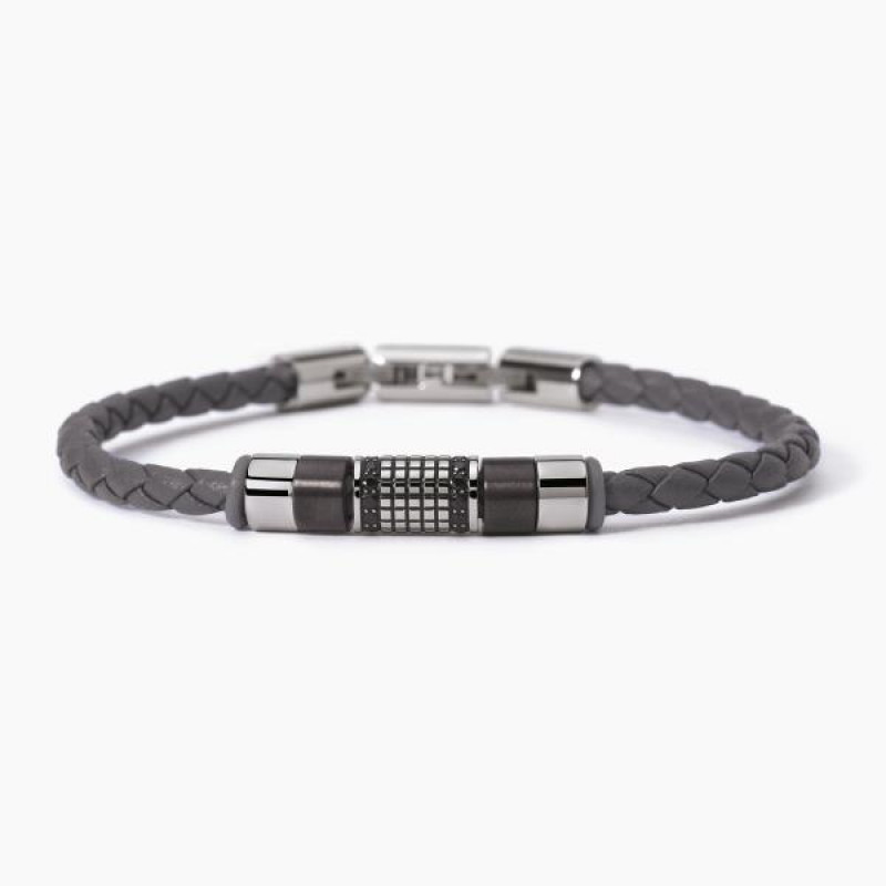 bracciale in acciaio 316L e pvd gun metal, elemento 7x29 mm, lab leather intrecciata grigia e cristalli Ø 1.5 mm, lunghezza regolabile da 19 a 20.5 cm