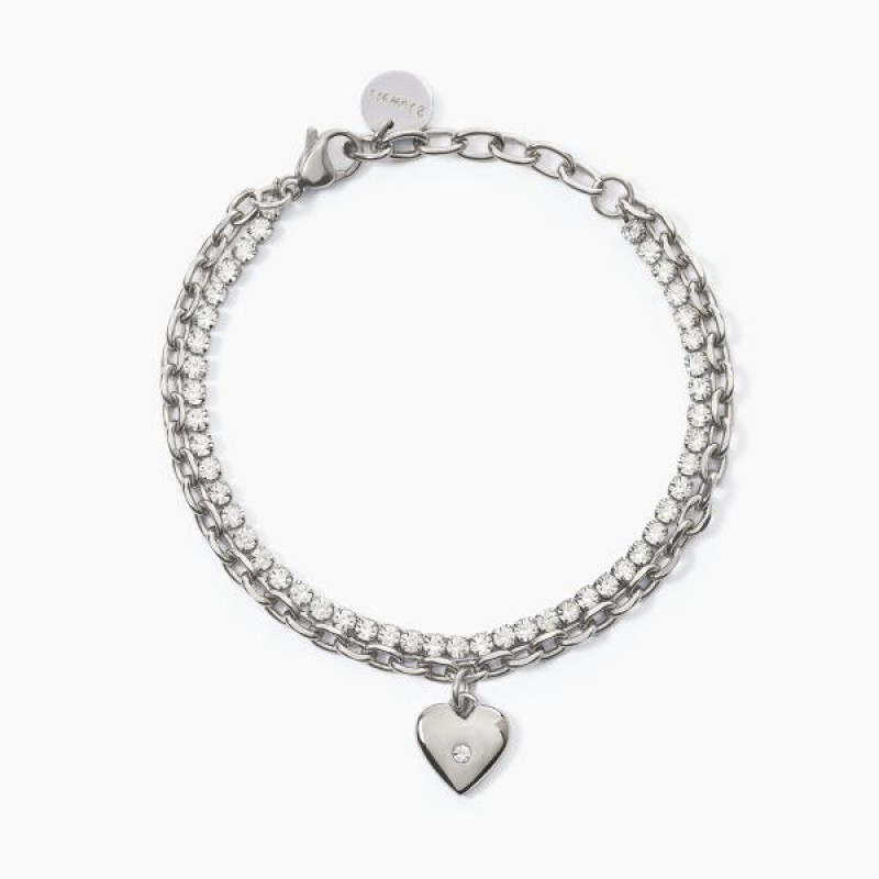 bracciale in acciaio 316L con catena forzatina 4 mm, pendente taglio cuore 10x11.5 mm, tennis di cristalli Ø 2.5 e cristallo 2 mm, lunghezza regolabile da 16 a 19 cm