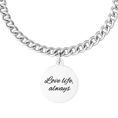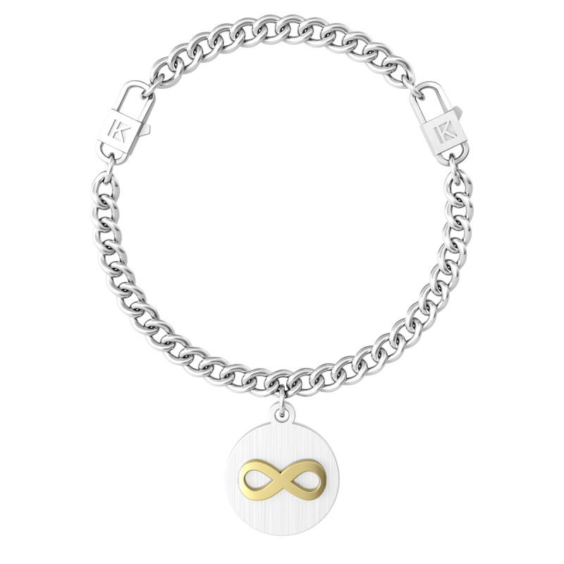 bracciale groumette in acciaio con ciondolo tondo lucido, infinito in pvd giallo lucido e cristallo lunghezza cm 19