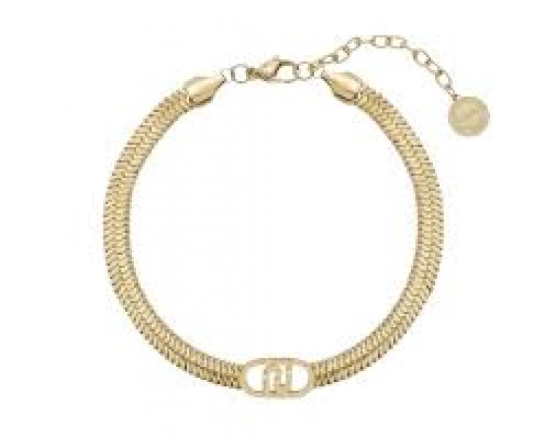 bracciale da donna della marca liu jo, il gioiello è realizzato in acciaio gold stile snake con logo centrale. la chiusura con moschettone.