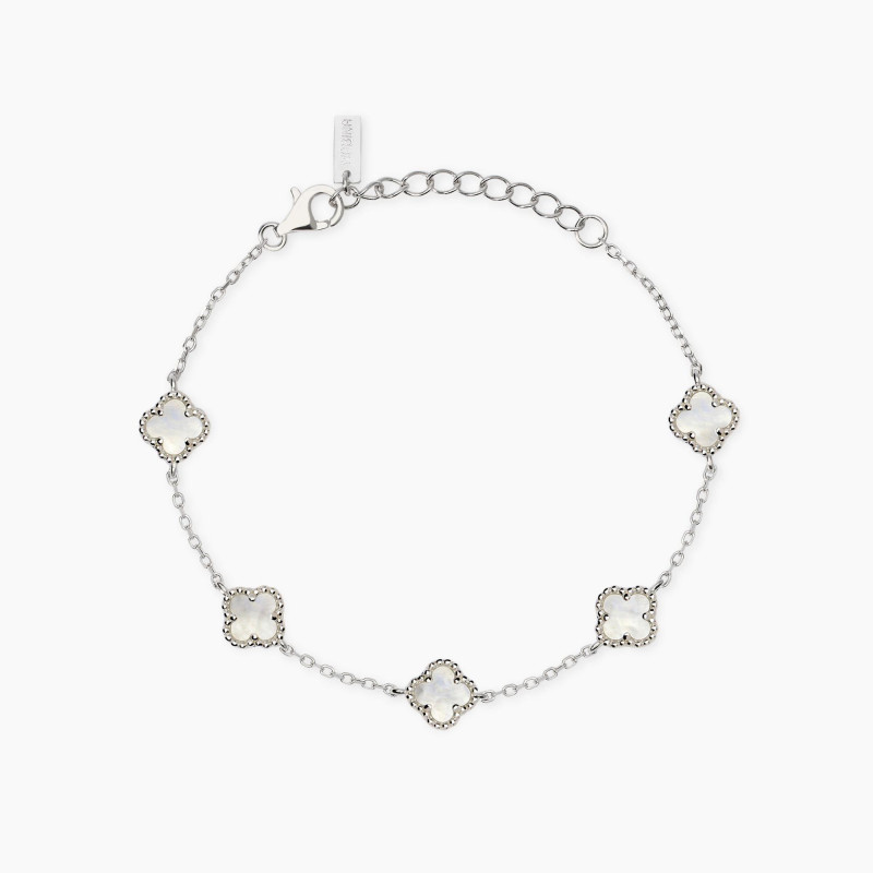 bracciale regolabile in argento rodiato con catena forzatina diamantata e fiori in madreperla.