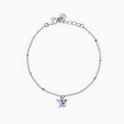 bracciale regolabile da bambina in argento rodiato con catena forzatina, applicazioni smaltate e ciondolo a forma di farfalla in tormalina sintetica rosa e zirconi multicolor taglio a navette.