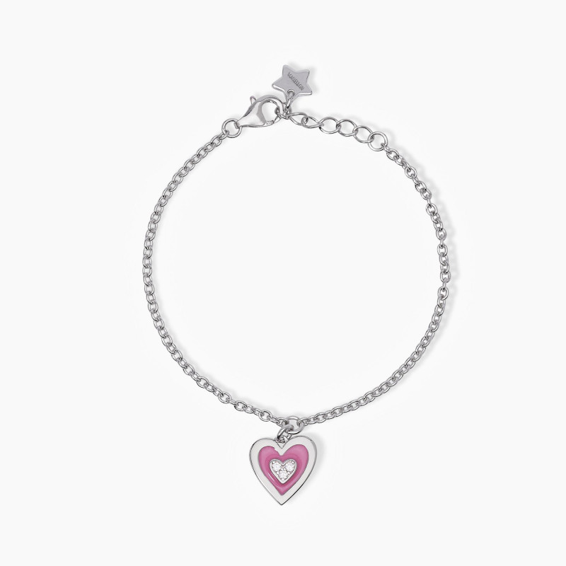 bracciale bimba in argento rodiato con catena forzatina e cuore pendente smaltato con zirconi bianchi.
