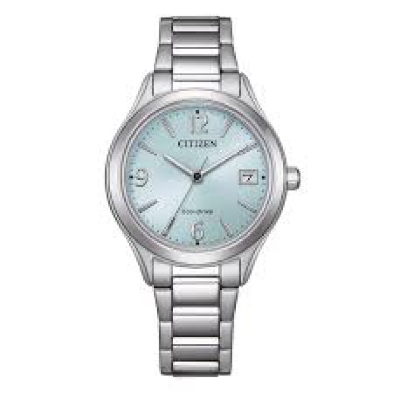 orologio donna, quadrante azzurro, cassa in acciaio con fondo a pressione, bracciale in acciaio con chiusura deployante, movimento eco-drive, vetro minerale, resistente all'acqua 5 bar. cassa 33,5 riserva di carica di 8 mesi.