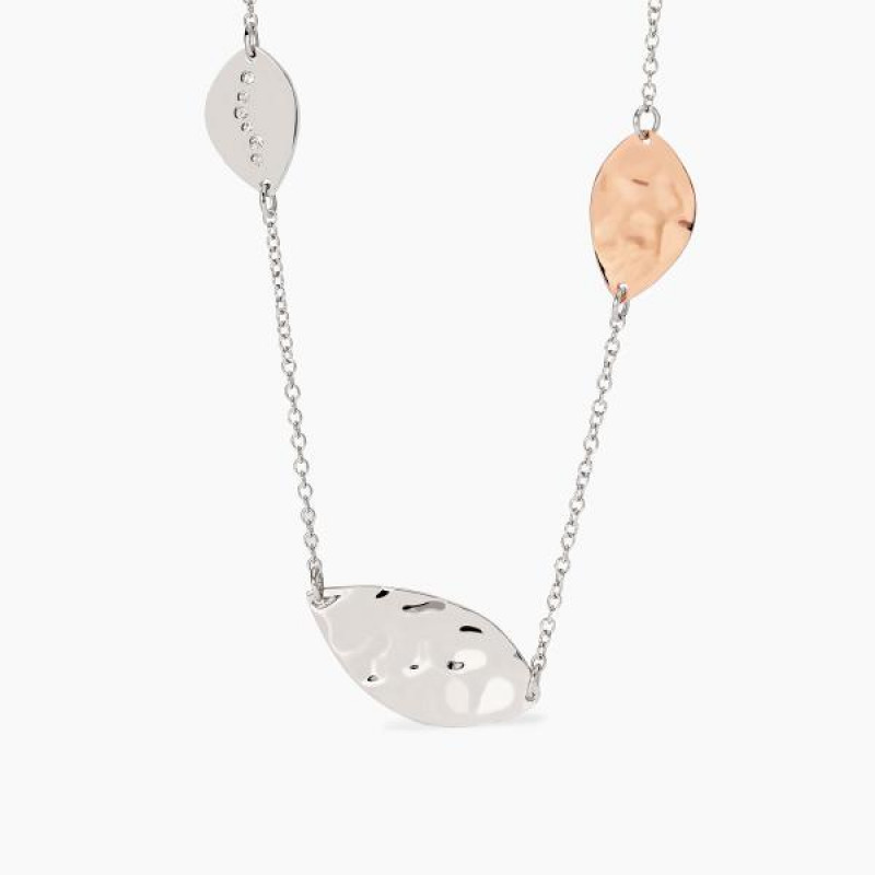 collana in acciaio 316l con catena rolò 2 mm, elementi 19x12 mm, martellati 31x16 mm e con pvd rosé 21.5x13.5 mm e cristalli ø 1.5 e 1.2 mm, lunghezza 90 cm