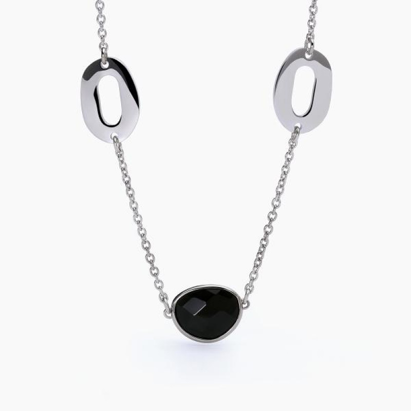 collana in acciaio 316L con catena forzatina 2 mm ed elementi ovali 22x15 mm, elementi in glass nero 17x15 mm e perle conchiglia Ø 8 mm, lunghezza 90 cm