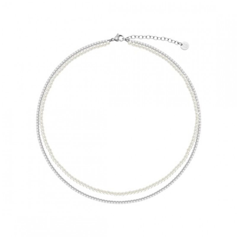 collana da donna della marca liu jo, il gioiello è realizzato in acciaio con un filo di perle e uno di zirconi. la chiusura con moschettone.