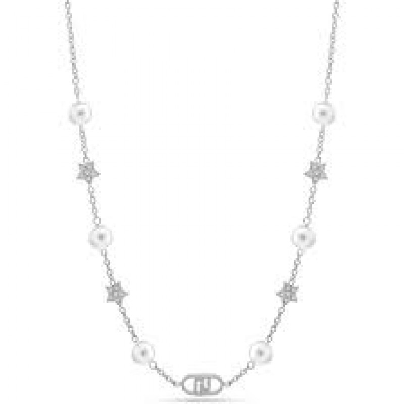 collana realizzata in acciaio con perle sintetiche e stelle con zirconi, lunghezza regolabile dai 45 ai 50cm, chiusura a moschettone.