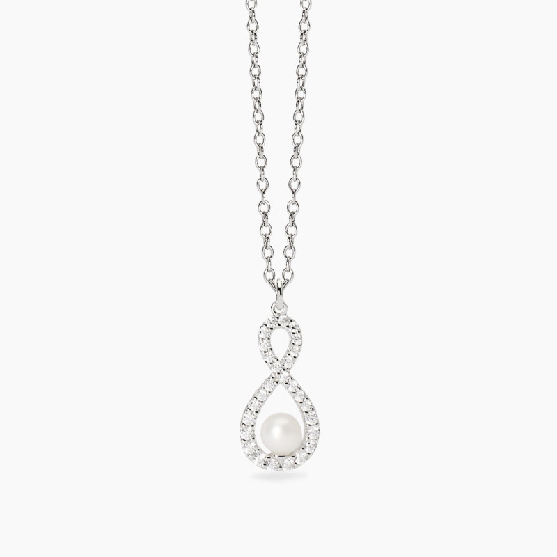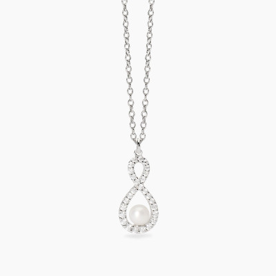 girocollo in argento con catena rolò e pendente forma infinito in zirconi e perla coltivata.