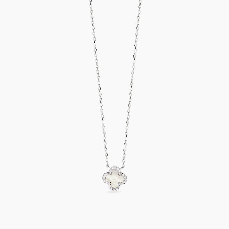 girocollo regolabile in argento rodiato con catena forzatina diamantata e fiore con madreperla e zirconi.
