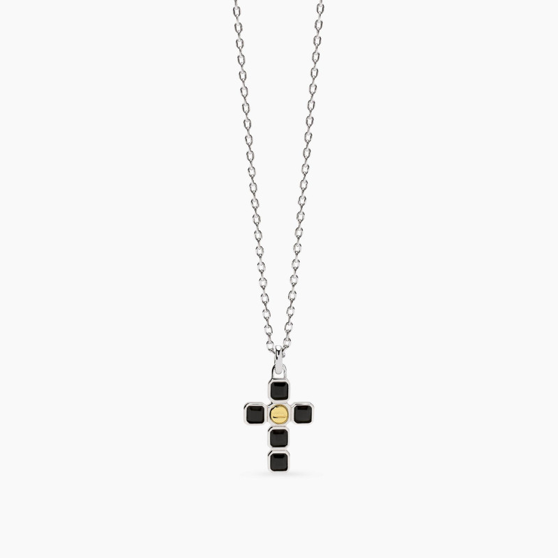 collana con catena forzatina diamantata in argento rodiato e croce con zirconi neri e vite centrale placcata oro 18k.