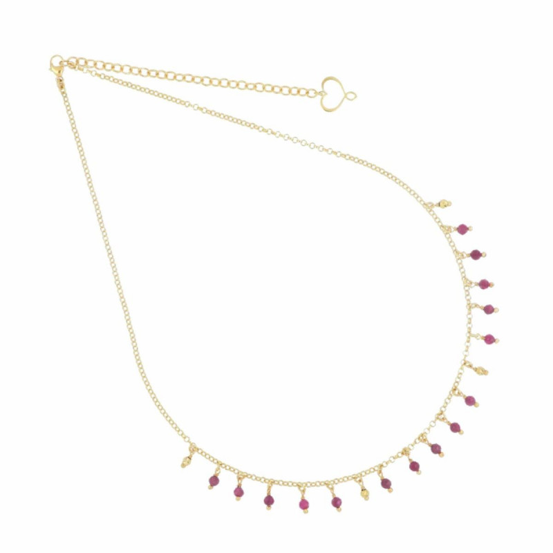 presenta una serie di pietre di rubino sfaccettato pendenti.