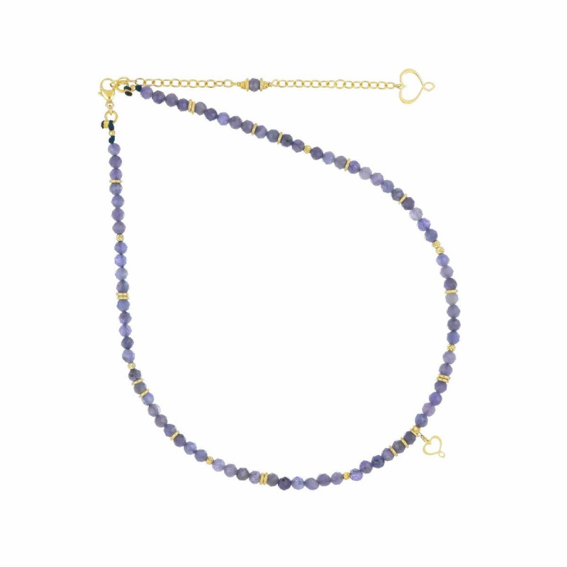 girocollo in argento 925 con galvanica oro giallo ad alto spessore e ad alta resistenza. il girocollo è ricoperto per tutta la sua superficie da pietre di tanzanite sfaccettato alternate ad elementi decorativi in argento. presenta al centro mini cuore maman pendente.