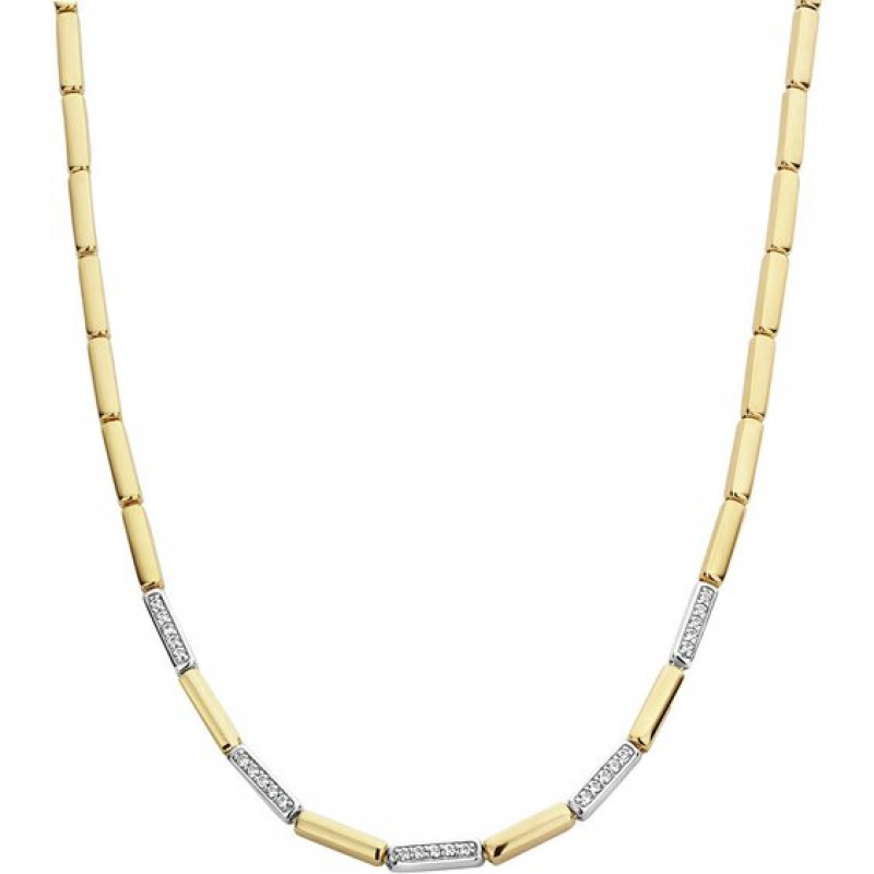 questo gioiello ti sento è caratterizzato da un susseguirsi di elementi rettangolari in argento 925 placcato oro giallo alternati ad elementi realizzati in argento 925 rodiati ed impreziositi da zirconi bianchi. un raffinato accessorio che diventa protagonista del tuo look. chiusura a scatto con sicurezza. la lunghezza è di 42 cm.