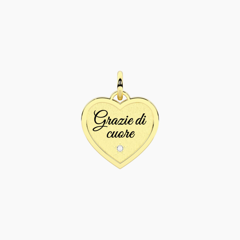 ciondolo a forma di cuore in acciaio e pvd giallo satinato e lucido con cristallo bianco e scritta "grazie di cuore". retro ideale per incisione.