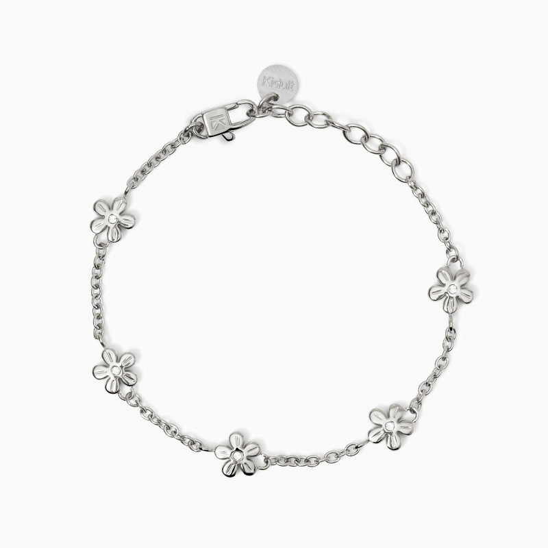 bracciale da donna regolabile con catena rolò e fiori in acciaio e cristalli.
