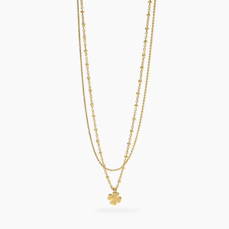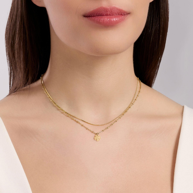 girocollo regolabile in acciaio dorato con catene rolò e serpentina, e ciondolo quadrifoglio.