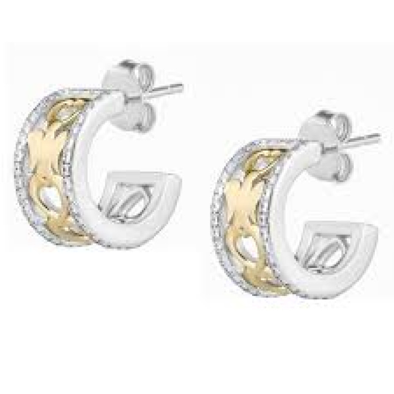 gioiello da donna roberto giannotti della collezione microlighting realizzato in argento 925 placcatura rodio silver - gli orecchini, modello a cerchio, caratterizzati ai lati da una fila di luminosi zirconi bianchi sono impreziositi al centro da cuori traforati ed angeli in argento 925 placcatura oro giallo - chiusura con perno e farfallina - diametro orecchini: 1,3 cm -
