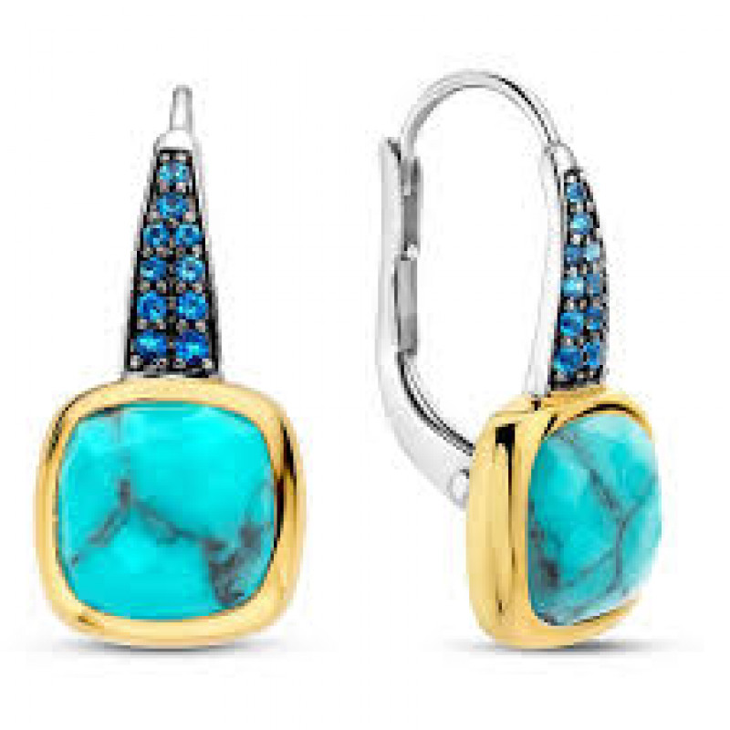 orecchini a monachella che presentano una pietra turchese a forma di cuscino, incastonata a mano in una montatura placcata oro. impreziositi da un pavè di zirconi blu scuro. realizzati in argento sterling 925. come tutti i nostri gioielli questi orecchini sono privi di nichel