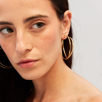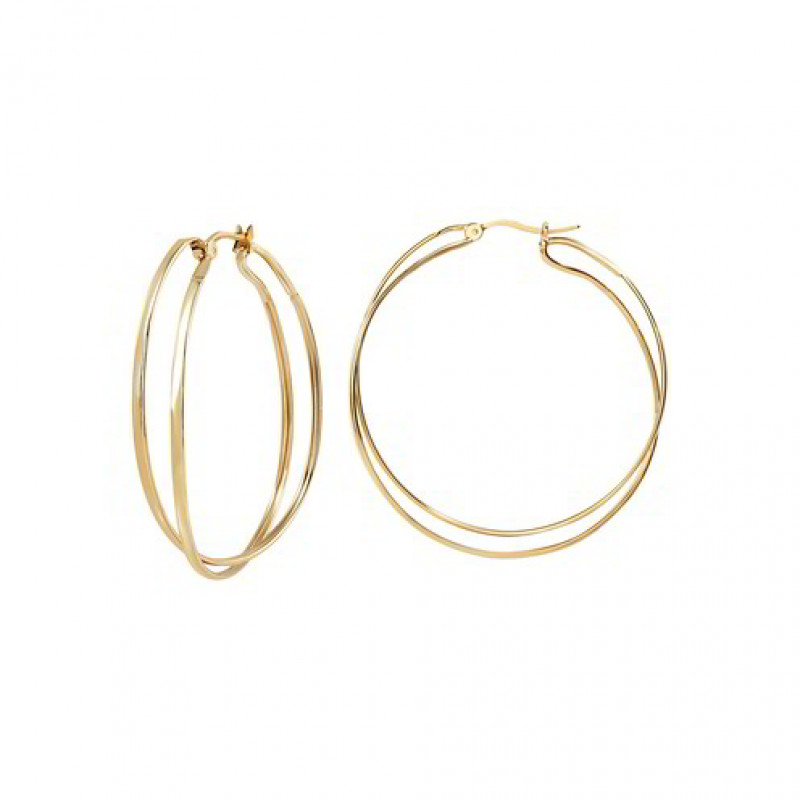gli orecchini della collezione lightline, con il loro design a doppio cerchio, rivisitano il classico con un tocco moderno e affascinante. realizzati in acciaio lucido color oro, la loro silhouette unica crea un effetto luminoso e dinamico, perfetto per aggiungere un tocco di luce a ogni look.