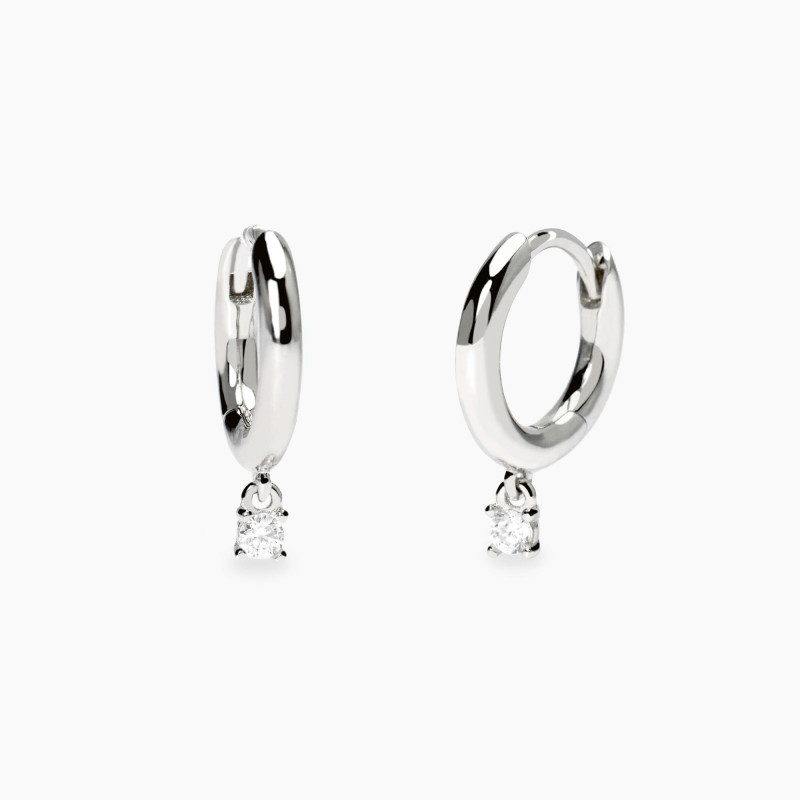 orecchini a cerchio in argento rodiato 925 con pendente in diamante lab-grown 0,07 ct. diametro cerchio esterno: 11,6 mm, lunghezza totale dell'orecchino: 1,5 cm