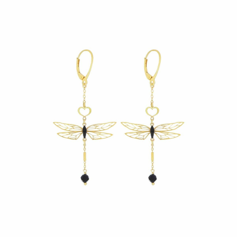 coppia di orecchini a monachella realizzato in argento 925 con galvanica oro giallo ad alto spessore e resistenza. l'orecchino presenta cuore maman e una libellula in lastra bidimensionale finitura lucida e corpo smaltato in nero di dimensioni 3 cm con sfera di spinello sfaccettata di 4mm all'estremità della coda.